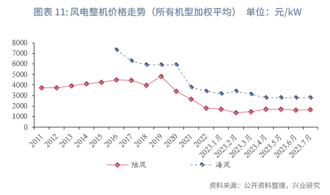 7月叶片和电缆主要材料价格反弹。7月环氧树脂均价12984元/吨,环比上升5.1%;碳纤维均价118.7元/千克,环比持平;电解铜均价68839元/吨,环比上升1.3%。