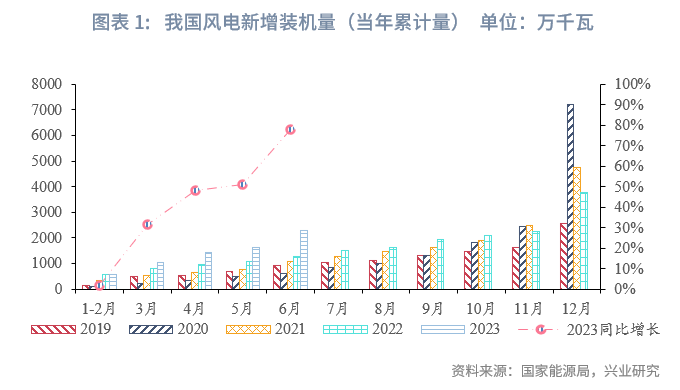 6月当月我国风电新增装机同比大幅提升,1-6月累计装机容量持续增长。6月当月我国风电新增装机663万千瓦,同比增长212.7%。1-6月,我国风电新增装机2299万千瓦,同比增长77.7%;平均利用小时数1237小时,同比增长7.2%;风电投资761亿元,同比增长34.3%;规模以上风力发电量为4246.4亿千瓦时,占全部电力来源的10.2%。截至6月底,我国累计风电装机38921万千瓦,同比增长13.7%。