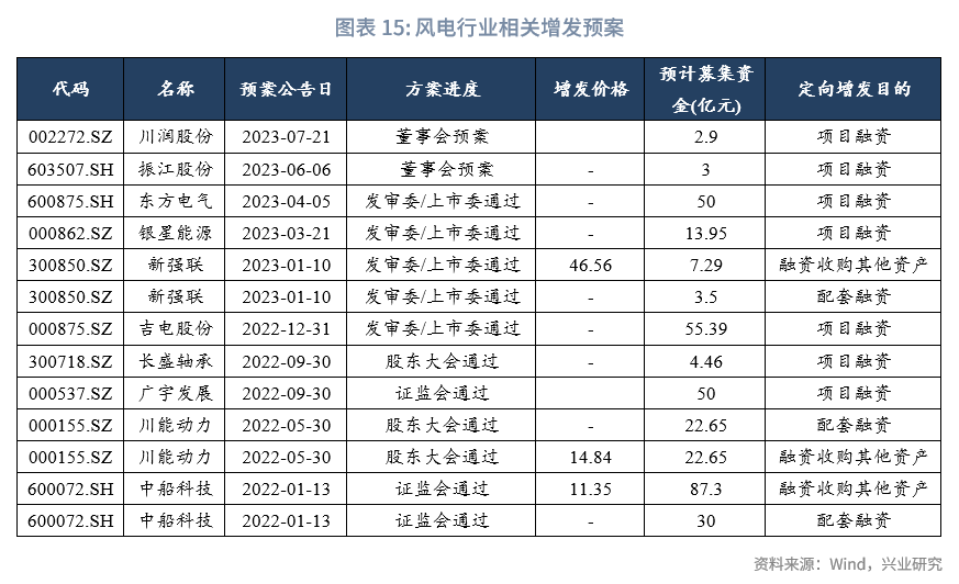 增发:共13起增发预案,预计募集资金约353亿,涉及风场、整机、铸锻件、轴承和润滑等环节。近期有三起预案进度更新,一起预案实施。