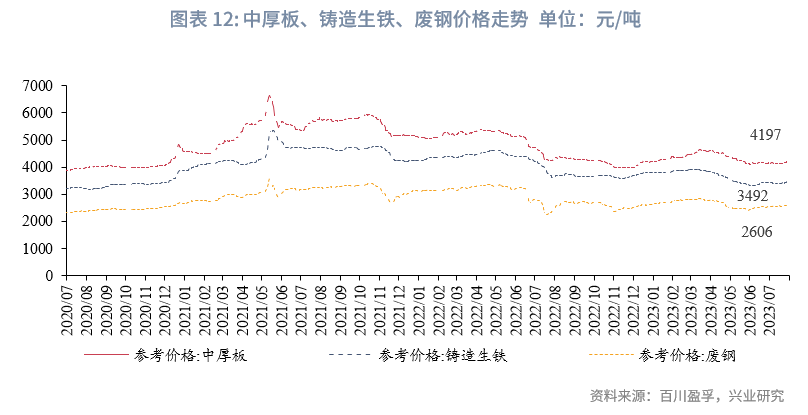 7月整机主要材料钢铁价格整体平稳。7月中厚板均价4153元/吨,环比上升0.1%;铸造生铁均价3429元/吨,环比上升1.4%;废钢均价2574元/吨,环比上升2.4%。