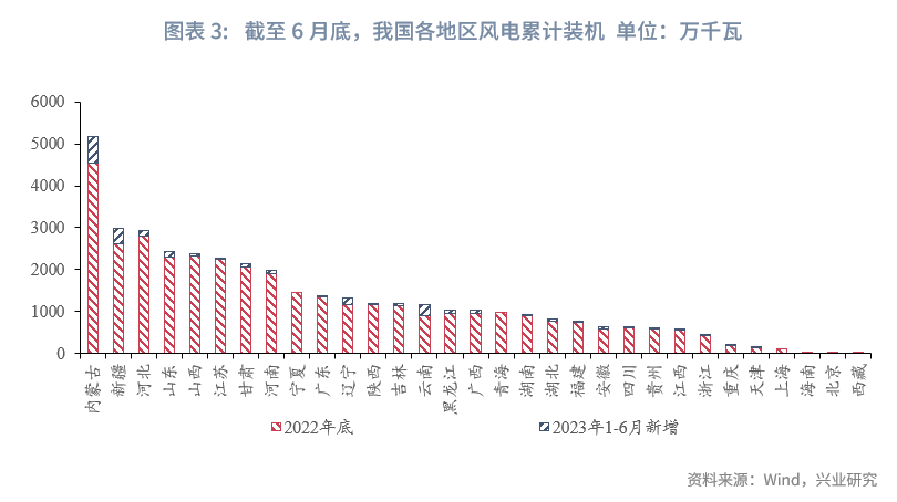 1-6月内蒙古风电新增装机容量领先全国。1-6月内蒙古以638万千瓦新增风电并网装机容量位居全国第一,除此之外,新疆(362万)、云南(261万)、辽宁(156万)、河北(129万)、山东(119万)等地新增容量位居全国前列。截止到6月底,内蒙古以5186万千瓦的风电累计并网装机容量继续位居全国第一,新疆、河北、山东、山西、江苏和甘肃均超过2000万千瓦。