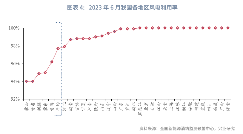 6月我国平均风电利用率稳中有升。6月的全国平均风电利用率为97.7%,同比上升0.72%,环比上升1.24%。全国共15个地区风电利用率为100%,主要分布在中东部,弃风现象相对较突出的有蒙西(94.0%)、甘肃(94.0%)、新疆(94.9%)和蒙东(95.0%)等地。