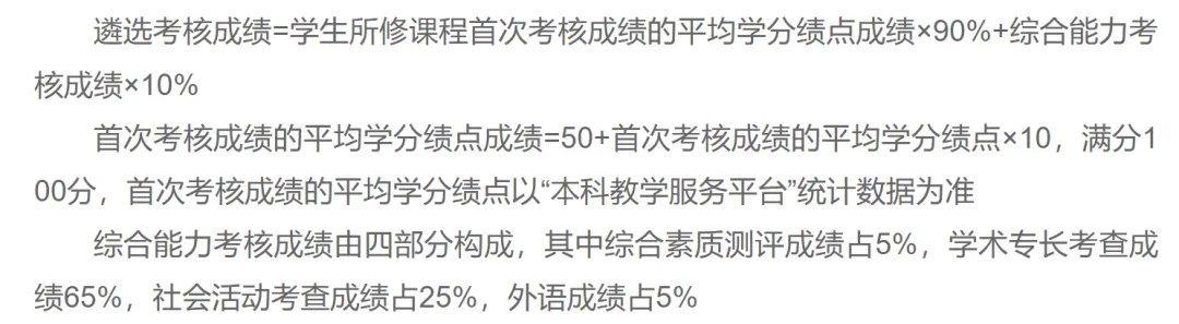 遴选考核成绩=学生所修课程首次考核成绩的平均学分绩点成绩×90%+综合能力考核成绩×10%