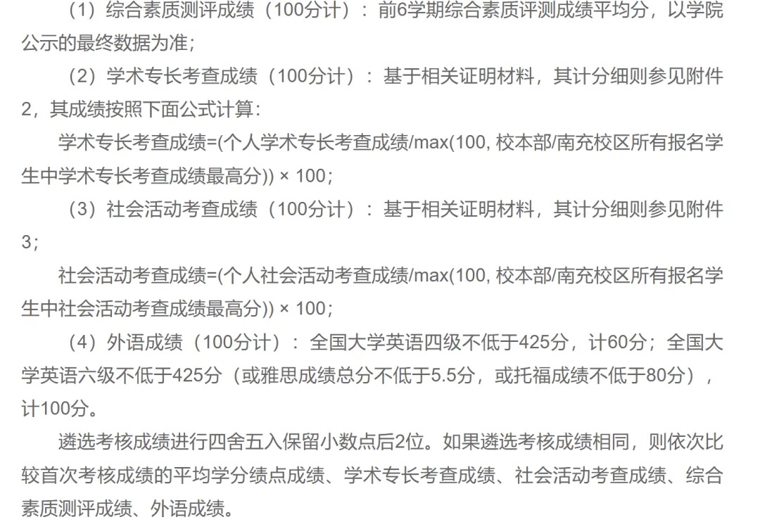 遴选考核成绩进行四舍五入保留小数点后2位。如果遴选考核成绩相同,则依次比较首次考核成绩的平均学分绩点成绩、学术专长考查成绩、社会活动考查成绩、综合素质测评成绩、外语成绩。