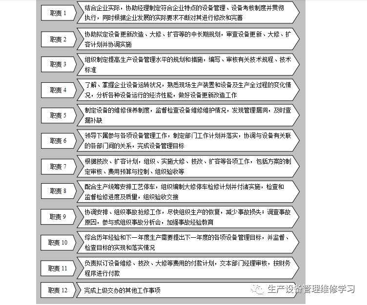 设备部主管的主要职责是在设备部经理的领导下,协助制定设备维修保养、更新报废等制度并监督实施,拟订设备更新改造、大修的中长期规划,组织做好设备的日常保养、维护管理等工作,以保证企业生产的正常进行,并避免事故发生。其具体职责如图1-12所示。