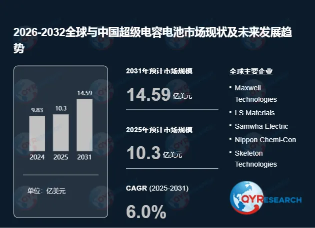 根据QYR(恒州博智)的统计及预测,2025年全球超级电容电池市场销售额达到了10.3亿美元,预计2031年将达到14.59亿美元,年复合增长率(CAGR)为6.0%(2025-2031)。