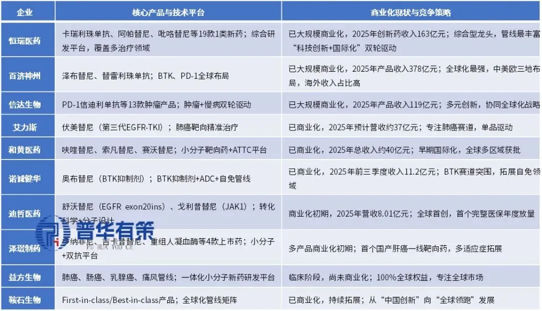从企业发展格局来看,头部企业优势明显,恒瑞医药、百济神州、信达生物等企业在创新药研发、生产、销售等环节均处于行业领先地位,拥有较强的资金实力、研发团队和丰富的管线储备,对市场有较大的影响力,引领着行业的发展方向。与此同时,和黄医药、迪哲医药、艾力斯、泽璟制药、益方生物、诺诚健华、鞍石生物等一批专注于肿瘤领域的创新型生物科技公司,正凭借差异化管线在细分赛道快速崛起,形成“传统龙头+创新新锐”的双轮驱动格局。