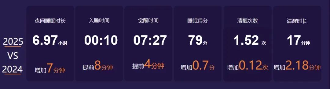 夜间睡眠时长增加7分钟,达到6.97小时 入睡时间提前8分钟,平均在次日0:10入睡 觉醒时间提前4分钟,平均在7:27起床 睡眠得分增加0.7分,达到79分