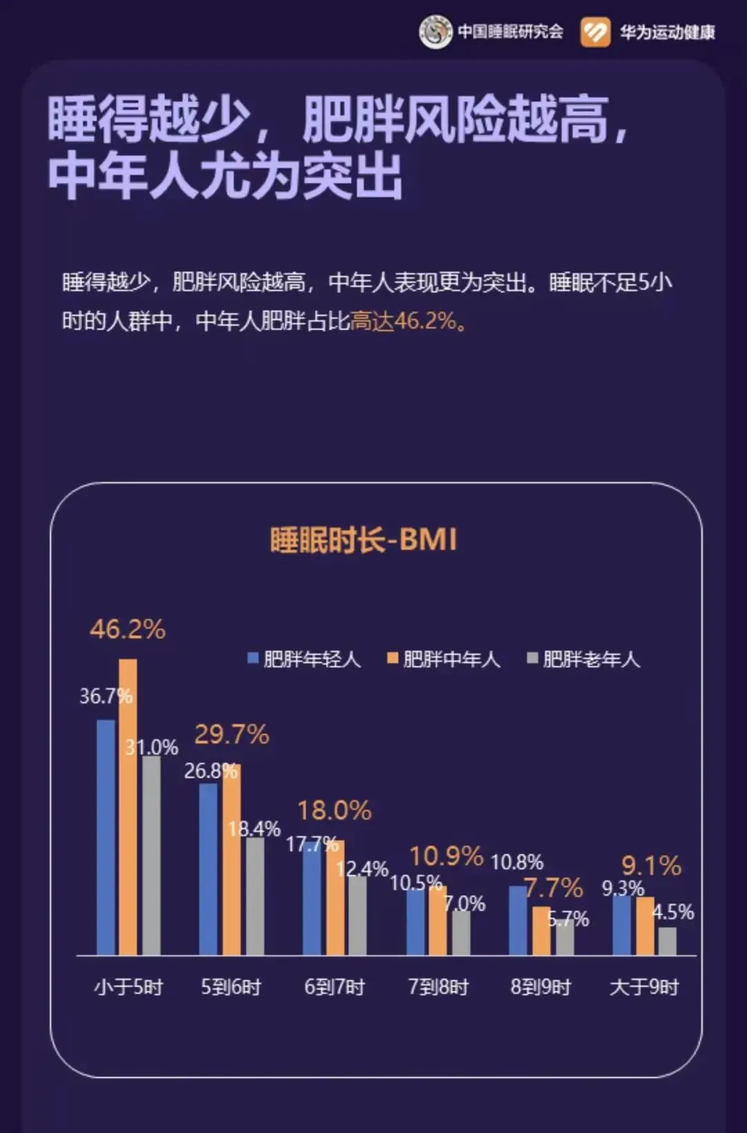 此次白皮书报告系统揭示了睡眠与肥胖的关系,睡眠时长越短,肥胖风险越高: