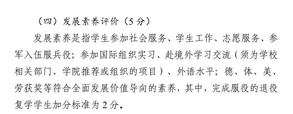 综合评价成绩满分100分,其中,学业平均学分绩点(GPA)折算分总分为85分,创新能力评价总分为10分,发展素养评价分总分为5分。单项累计总分不得超过该项最高分,分值按四舍五入保留至小数点后两位。