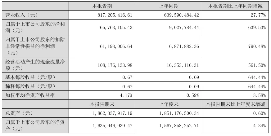 归属于上市公司股东的净利润6676.31万元,同比增长639.53%;归属于上市公司股东的扣除非经常性损益的净利润6119.30万元,同比增加790.48%