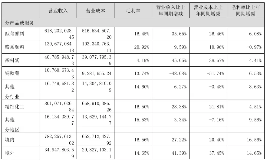 铬系颜料,颜料紫和铜酞菁也分别实现了营业收入的增长。铬系颜料营业收入为1.30亿元,同比增加9.69%,毛利率为20.92%,同比减少0.97%;颜料紫营业收入为4078.59万元,同比增加45.05%,毛利率为4.19%,同比增加4.41%;铜酞菁营业收入为1076.06万元,同比减少48.08% ,毛利率为13.74% ,同比增加6.53%。