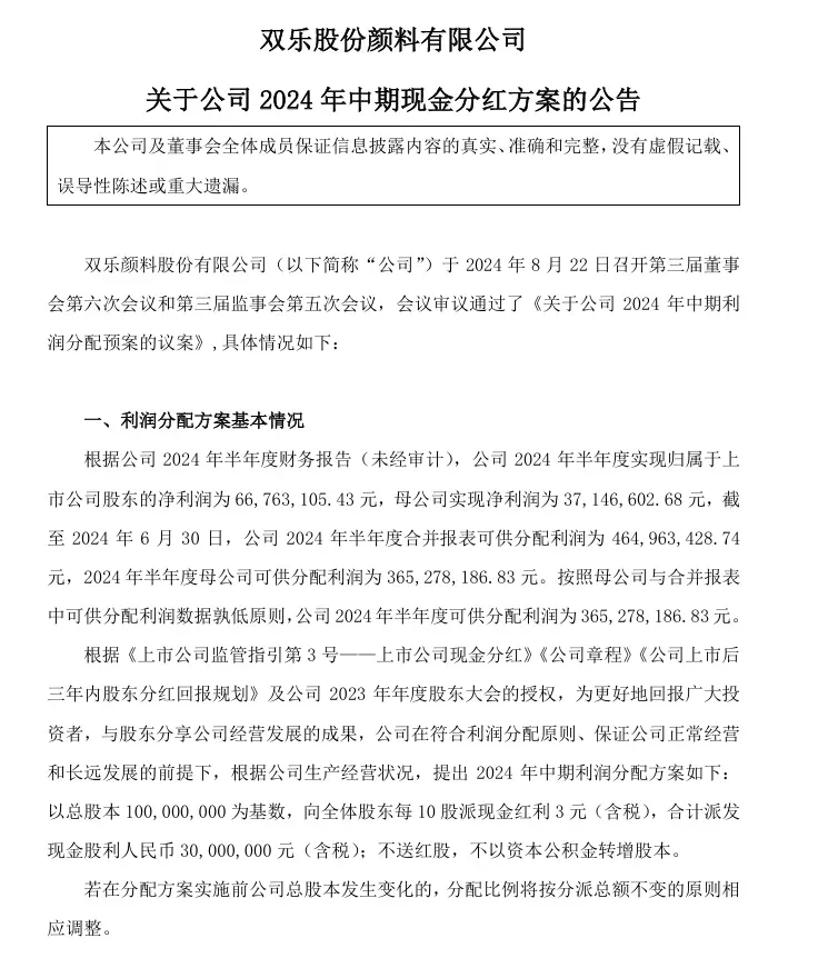 2024年8月22日,第三届董事会第六次会议和第三届监事会第五次会议,会议审议通过了《关于公司2024 年中期利润分配预案的议案》。根据该预案,双乐股份计划以总股本1亿股为基数,向全体股东每 10 股派现金红利 3 元(含税),合计派发现金股利人民币3000万元人民币(含税);不送红股,不以资本公积金转增股本。这一慷慨的利润分配方案,不仅体现了公司对股东的积极回馈,也彰显了双乐股份对股东利益的高度重视和良好的企业治理结构。