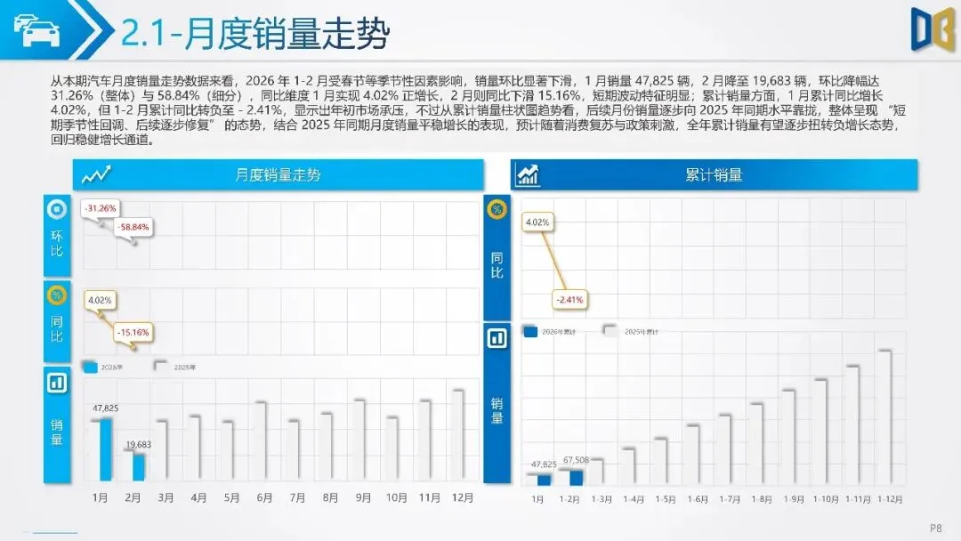 从本期汽车市场数据来看,国产车型以月度85.51%.累计86.07%的占比牢牢占据市场主导地位,进口车与商用车占比稳定在10%左右:1-2月受春节等季节性因素影响,销量环比显著下滑,其中国产车环比下降30.16%、进口车环比降幅达58.46%,但国产乘用车实现8.58%的同比正增长,而进口车与商用车同比这少等复的时性,国广自代应物排练课化,成为取之中场集心事业的限公司事,后续高考终极对战马满贷款节奏,以判断器口车与高用车号Fr33,55结构分化特征明显;累计销量方面,尽管1-2月累计同比短暂转负3至-1.49%,但整体累计销量同比增长8.58%,显示出市场在短期波动信及全年增长动能能否进一步释放。