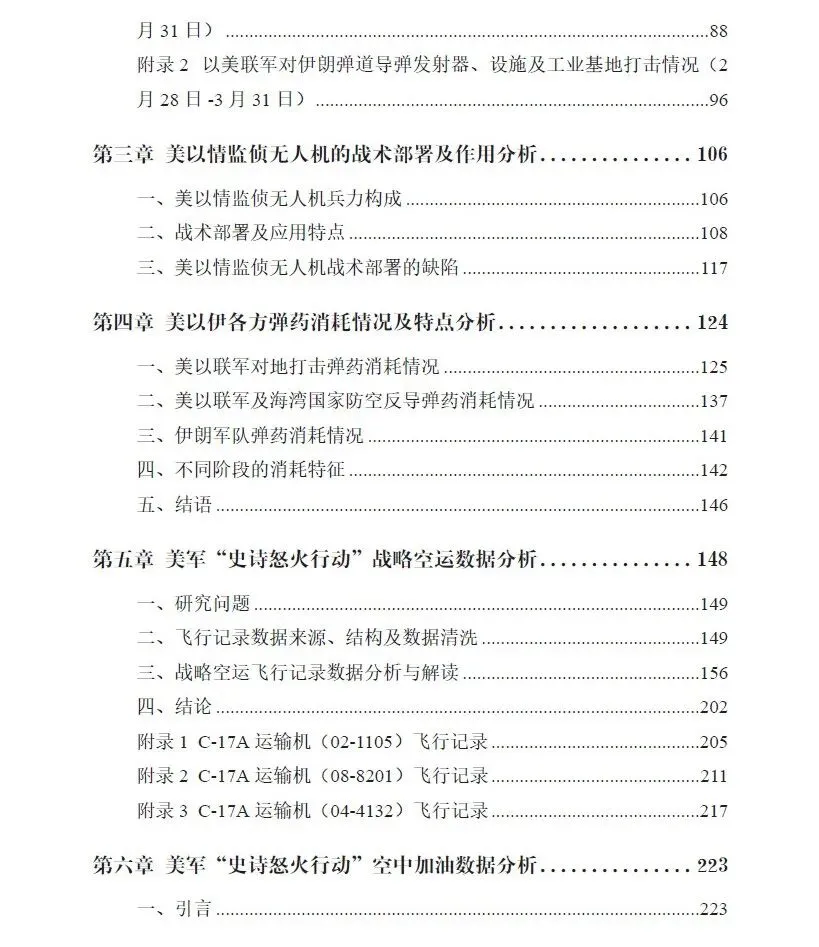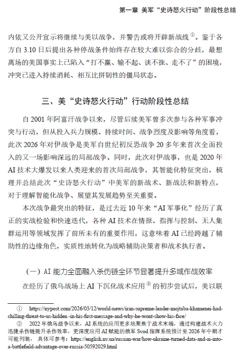 专题报告共分七章。第一章作为阶段性总结,试图从战略视角理解这场战争带来的新变化。鉴于战争突出的智能化特征,文章着重梳理并总结了美军新的战术、战法和特点,涉及AI与杀伤链全环节的融合、目标选择与打击范式的拓展以及“高精尖速决与低成本消耗”对决所预示的战争趋势。文章认为,AI已经跨越了辅助性的边缘角色,实质性地转化为战略辅助决策者和战术执行者。