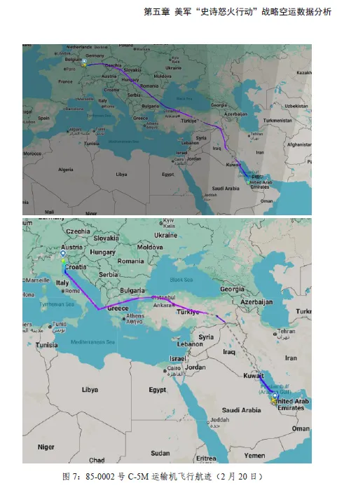 第五章聚焦美军战略空运行动,通过对近万条C-5M和C-17A运输机飞行记录进行梳理、分析和挖掘,旨在回答一个核心问题——在当前作战条件下,美军战略空运能力究竟发挥了多大效能?研究过程中,从数据分析角度系统刻画战略运输机出动率、飞行航线和节点、出动架次和运输量、飞机使用强度等指标,从而量化了其对战役持续保障能力的支撑效果。