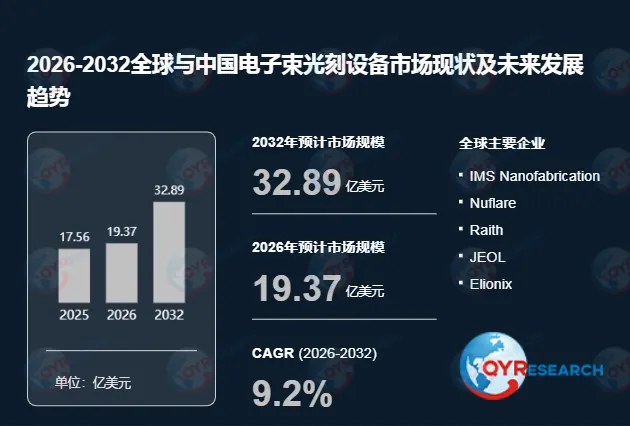 根据QYR(恒州博智)的统计及预测,2025年全球电子束光刻设备市场销售额达到了17.56亿美元,预计2032年将达到32.89亿美元,年复合增长率(CAGR)为9.2%(2026-2032)。