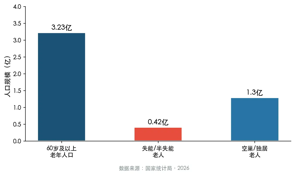 截至2025年末,全国60岁及以上老年人口达3.23亿,占总人口22.9%,其中失能、半失能老年人口规模突破4200万,空巢及独居老年人口超1.3亿(国家统计局,2026)。