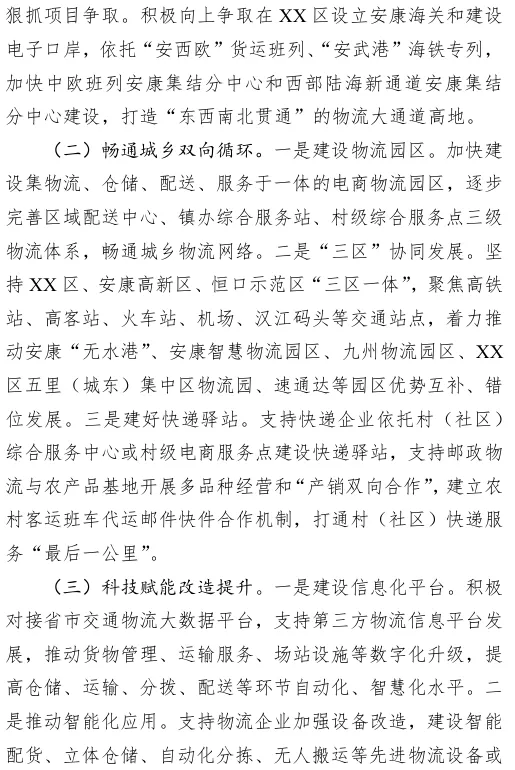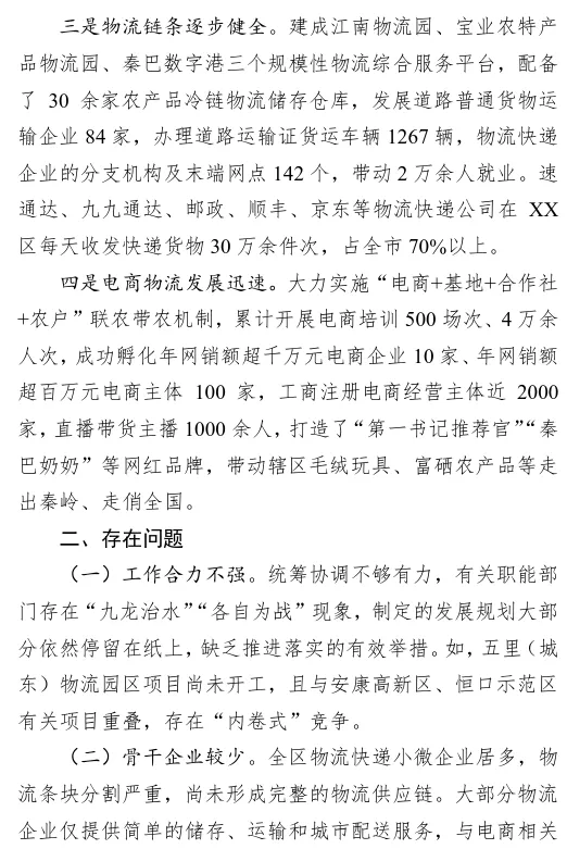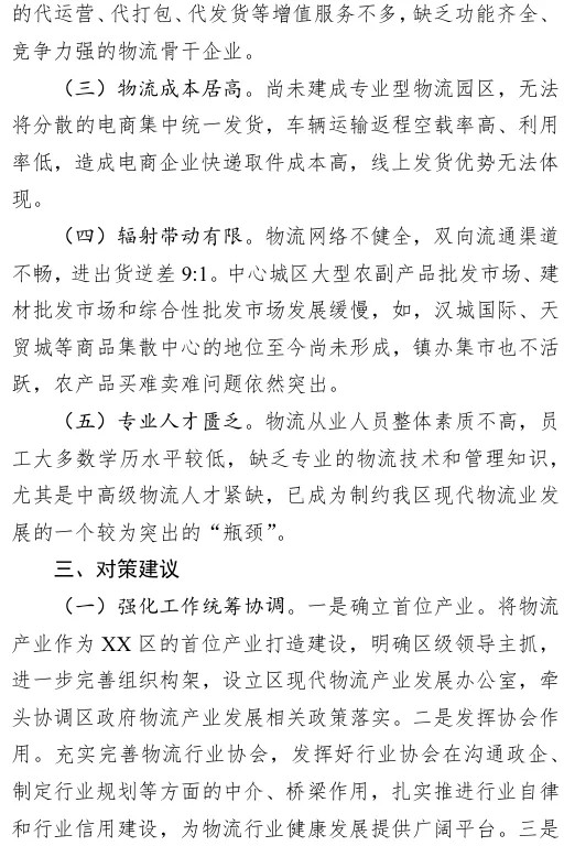物流业是支撑经济发展的基础性、战略性、先导性产业。近期,XX区政协对 XX区、安康高新区、恒口示范区“三区”现代物流产业进行了专题调研。