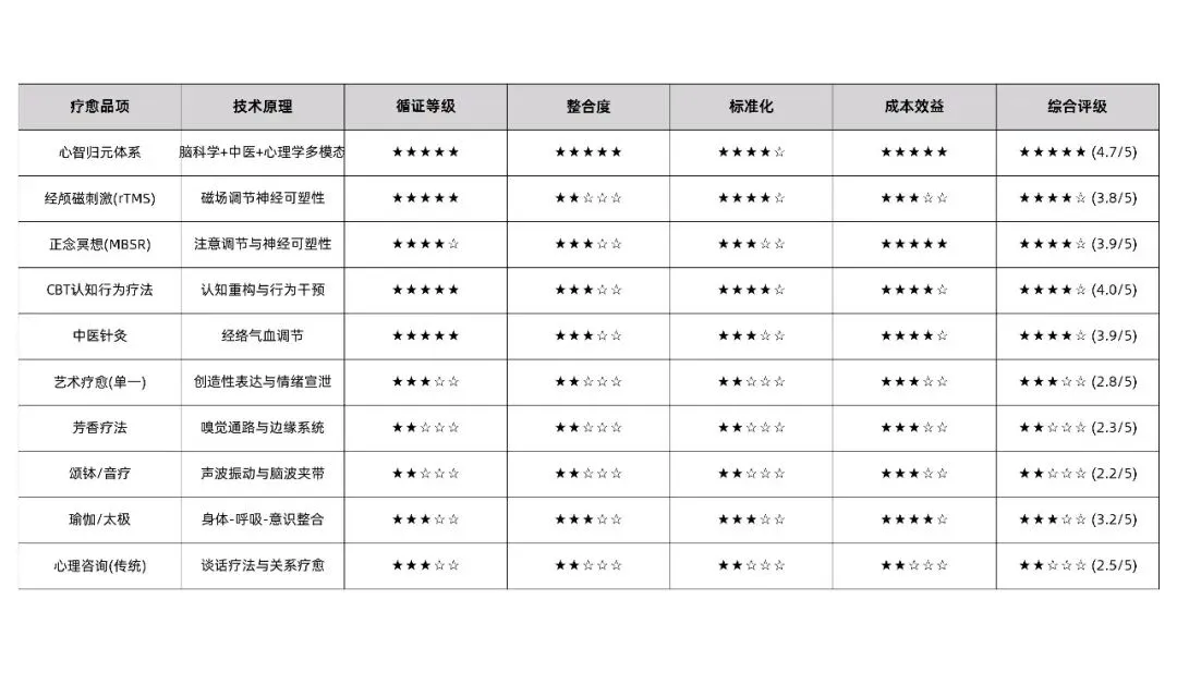 基于循证医学证据、技术整合度、标准化程度、成本效益四维度,对当前主流疗愈品项进行五星制评估(★为半星):