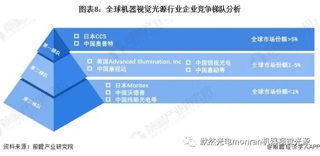 全球的视觉照明技术已经相对成熟,竞争较为充分。早期由海外企业占据大部分市场,如日本的CCS、美国的AI,近年来中国厂家逐步崛起,出现了奥普特、沃德普、锐视光电、纬朗光电等专业的机器视觉光源制造商,其技术足以与国际厂商竞争。