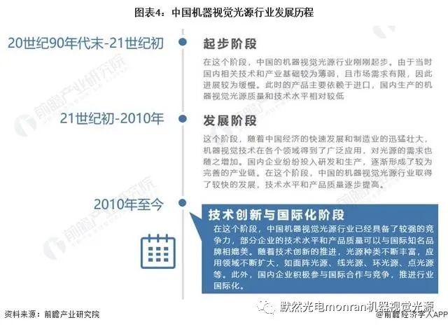 中国机器视觉光源行业的发展历程可以概括为三个阶段,整体来看,中国机器视觉光源行业经历了从起步到发展壮大再到技术创新与国际化的过程,目前已经具备较强的竞争力,中低端产品基本实现了国产化替代。在未来的发展中,随着人工智能、智能制造等领域的快速发展,机器视觉光源行业有望在技术创新、产品质量和应用领域等方面取得更大突破。