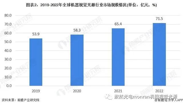 从市场发展来看,机器视觉光源行业是机器视觉技术中的重要组成部分,其市场规模快速增长。从全球机器视觉光源的市场规模变化情况来看,随着机器视觉的广泛应用,机器视觉光源的规模也在不断提升。根据机器视觉光源在机器视觉系统中的成本占比来看,2019-2022年全球机器视觉光源市场规模逐年增长,2022年增长至71.5亿元,同比增长了9.3%。