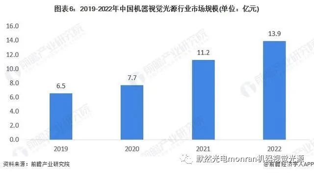 随着中国制造业的转型升级,机器视觉光源在中国市场得到了广泛应用。从中国的市场规模发展情况来看,根据测算,2019-2022年,中国机器视觉光源行业的市场规模逐年增长,2022年增长至13.9亿元。