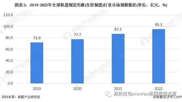 根据机器视觉光源(含控制器)在机器视觉系统中的成本占比来看,2019-2022年全球机器视觉光源(含控制器)市场规模逐年增长,2022年增长至95.3亿元。