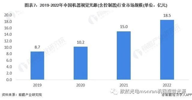 2019-2022年,中国机器视觉光源(含控制器)行业的市场规模逐年增长,2022年增长至18.5亿元。