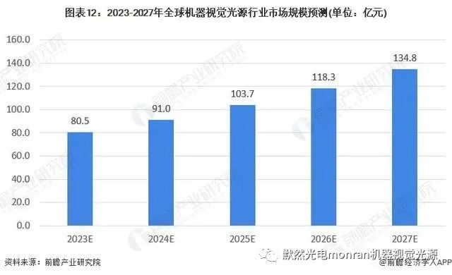从机器视觉光源的市场规模发展趋势来看,预计至2027年全球机器视觉光源市场规模将达到134.8亿元。2022年至2027年复合增长率约为13.5%。