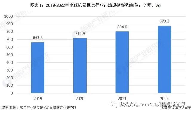 根据高工产业研究院(GGII)的数据,2021年全球机器视觉市场规模约为804亿元,同比2020年增长12.15%,2022年市场全球机器视觉市场规模初步统计为879.2亿元。