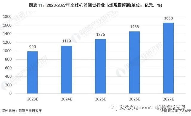 机器视觉光源是机器视觉系统的重要组成部分之一,而机器视觉在制造、半导体、医疗保健、安防监控、零售等众多领域中应用广泛,其中制造行业尤为重要。当前全球稳定的市场需求、新技术的推出以及全球行业的竞争局面不断升级,为机器视觉光源市场的发展提供了机遇。同时,全球各国也在加速实施数字化转型战略,这也将大大推动机器视觉光源市场的发展。预计未来几年,机器视觉光源市场将继续保持较为稳健的增长态势,在智能车间、智能制造、医疗保健、零售等领域发挥越来越重要的作用。预计至2027年全球机器视觉市场规模将超过1658亿元。2022年至2027年复合增长率约为13%。