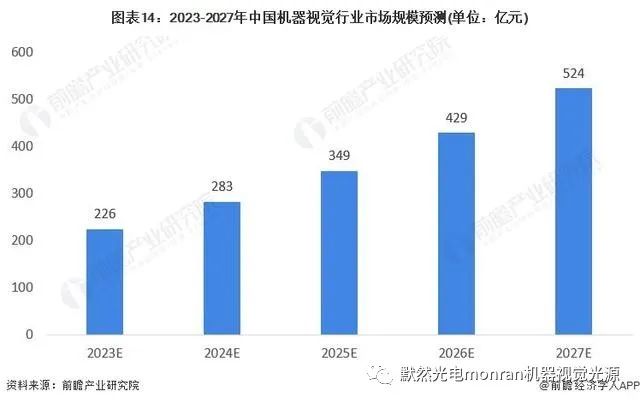 得益于经济持续稳定的发展、产业结构转型升级、制造业自动化及智能化进程加速、行业内企业自主研发能力增强、机器视觉产品应用领域的拓宽等因素,预计未来中国机器视觉行业规模将进一步增长,到2027年我国机器视觉市场规模将达524亿元,增长速度领先于全球。