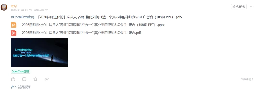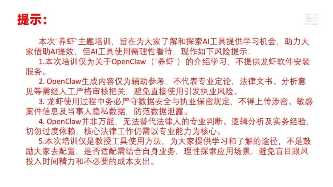 进阶应用:可将“龙虾”作为“前台总管”,通过API调用专业法律科技产品(如智合AI)作为“后台智库”,实现复杂法律研究、文书起草、合同审查等工作流的自动化。