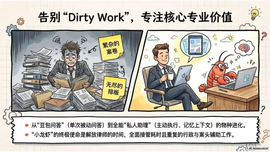 目标是帮助律师从耗时、重复的行政与案头辅助工作(“Dirty Work”)中解放出来,专注于核心专业价值。
