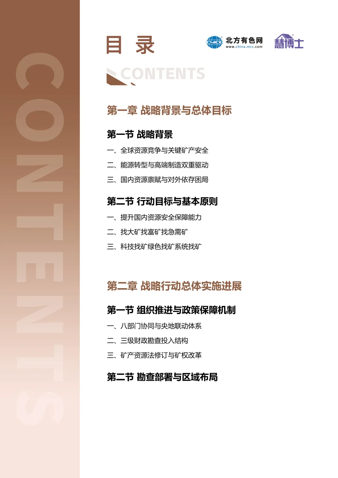 报告以提升国家战略性矿产资源自主保障能力为核心主线,构建了“战略背景—总体评估—分项进展—支撑体系—影响效益—政策保障—未来展望”的完整分析框架。报告首先分析了全球资源竞争新格局与国内资源供需的结构性矛盾,阐明了行动实施的紧迫性与战略意义,明确了“找大矿、找富矿、找急需矿”与“科技、绿色、系统”找矿相结合的基本原则及重点目标矿种。
