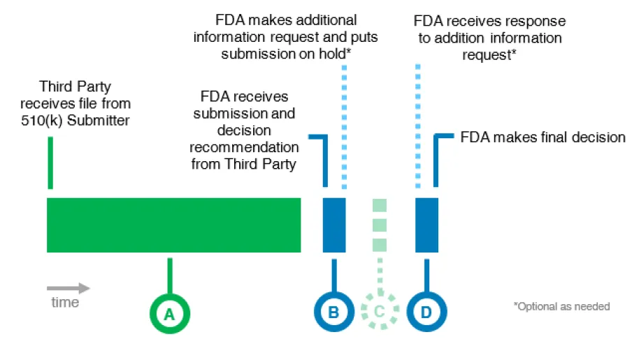 阶段A: 第三方审查机构从510(k)提交者处接收文件,对文件进行审查,并将文件及其决定建议发送给FDA。