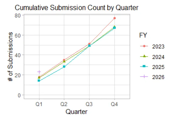 FY2026数据显示,FDA 510(k)第三方审查项目呈现出“效率提升”与“规模收缩”并存的特征。在MDUFA V框架下,绩效数据披露机制有效提升了监管透明度。