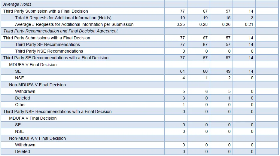 在MDUFA V周期内,FDA通过定期发布绩效报告(Performance Reports),对外披露包括510(k)审查在内的关键指标。同时,报告亦涵盖第三方审查项目(Third Party Review Program)的相关数据,如审查周期、补充信息请求情况等,从而提升行业对不同审查路径的可预期性。