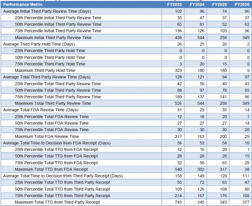 综合来看,FY2026第三方审查流程呈现出“审查重心前移至第三方阶段、FDA审查与决策时间压缩”的特征。