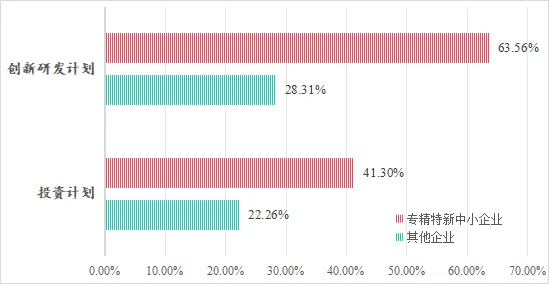 企业发展韧性和信心增强。面对复杂严峻的外部环境和国内经济转型压力,中小企业积极应对、主动作为,在政策支持下,经营状况逐步趋稳。问卷调查显示,2025年营业收入、利润保持稳定或增长的企业占比较上年分别提升10.14和10.65个百分点;但受经营成本上涨等因素影响,利润增幅仍低于营业收入增幅。企业发展信心逐步恢复,未来一年计划创新研发的企业占比保持高位,有投资计划的企业占比较上年有所上升。其中,专精特新中小企业展现出更强的韧性和发展动力,其营业收入保持稳定或增长的企业占比达73.37%,比上年提升8.68个百分点;分别有63.56%、41.30%的企业未来一年有创新研发计划和投资计划。