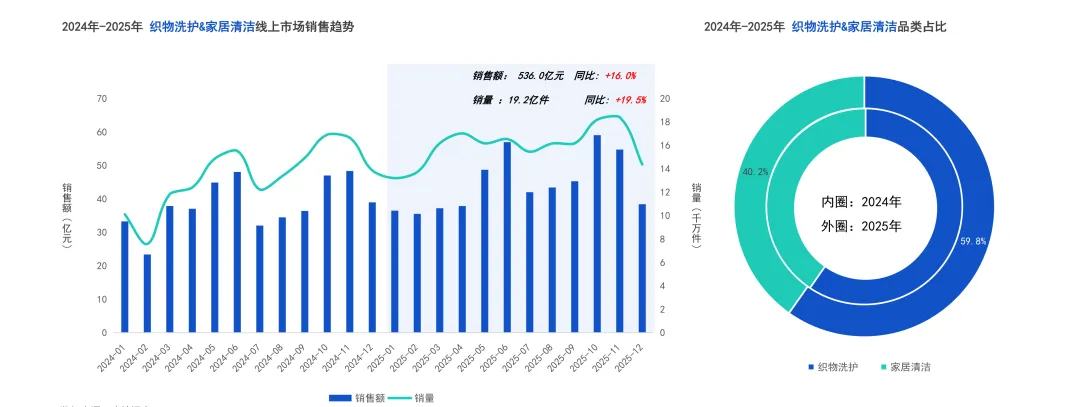 2025年织物洗护与家居清洁线上市场销售额突破536亿元,同比增长16.0%,销量达19.2亿件,同比增长19.5%。销售节奏上,5-6月与10-11月(双11)构成两大高峰,两大促周期合计贡献全年近30%的销售额,大促的战略地位持续强化。