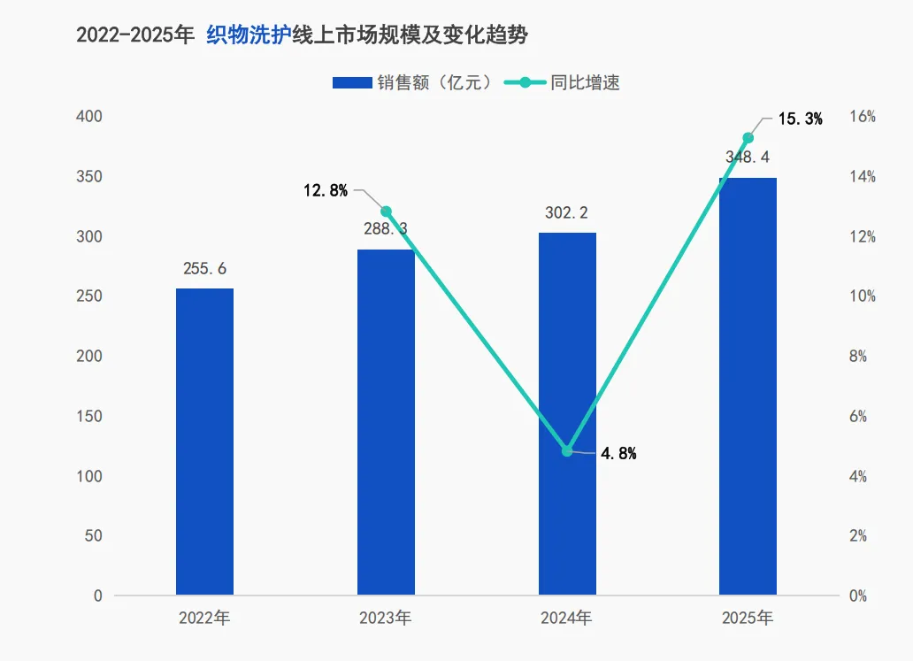 织物洗护线上市场持续增长,2025年销售额达348.4亿元,同比增速在2024年探底至4.8%后,2025年回升至15.3%,市场增长活力恢复。与此同时,精细化清洁护理品类崭露头角,柔顺剂、除菌剂市场份额增加,满足消费者衣物护理进阶需求。洗衣凝珠因价格偏高、溶解不彻底等因素,2025年市场份额同比下降3.5%。