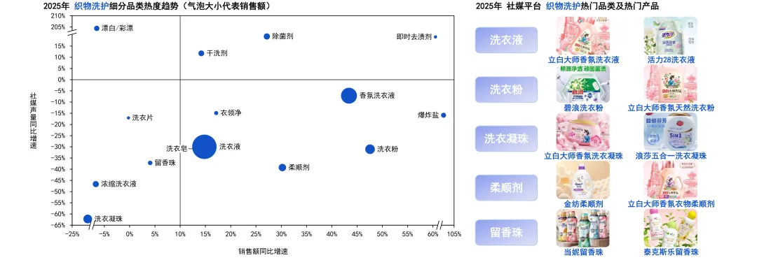 香氛洗衣液凭借43.4%的销售额同比增长,成为行业核心增长引擎;传统洗衣液体量领先、销售额同比有所增长,但声量下滑,呈现“大而不热”态势;即时去渍剂、除菌剂、干洗剂等细分品类热度与销售额增长稳健,为高潜力品类;漂白/彩漂社媒热度上升体现消费者护色需求觉醒,但销售额下滑反映品类被多功能产品替代,呈现“高关注、低转化”特征。