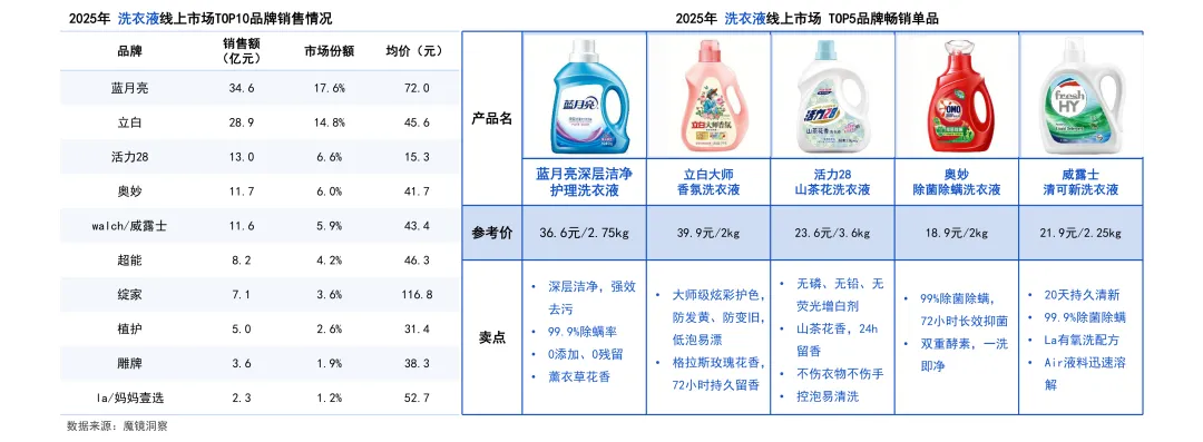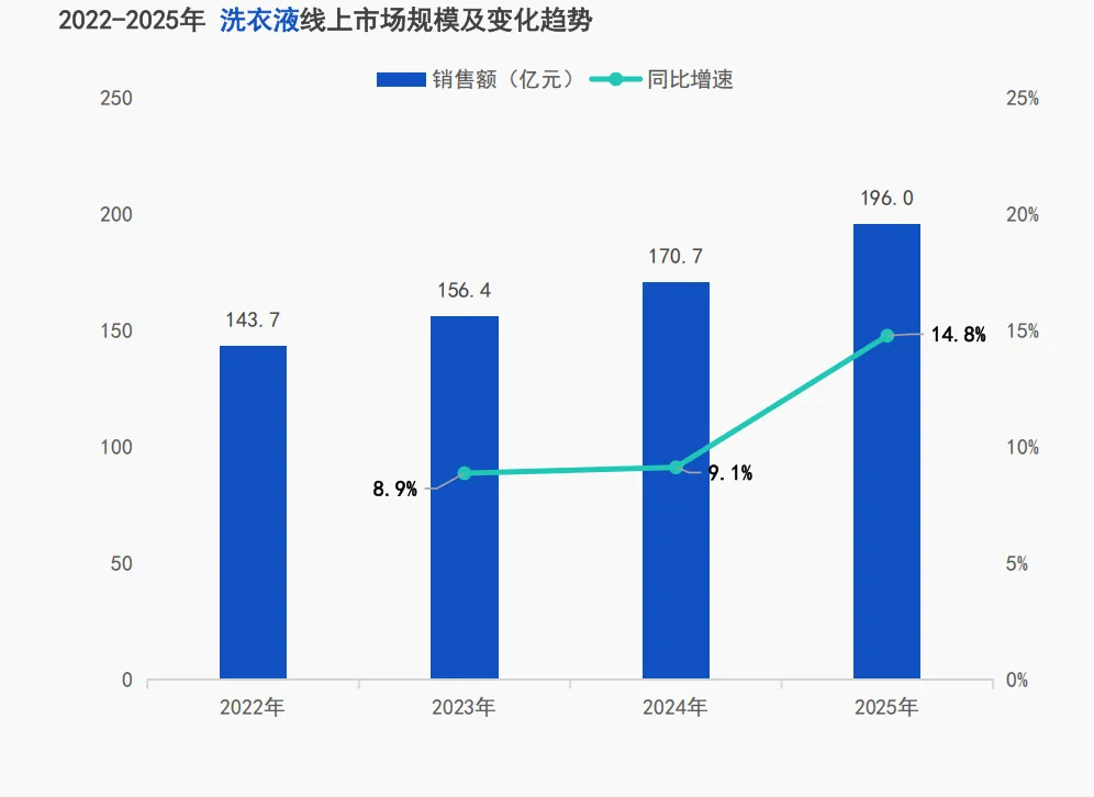 线上洗衣液市场销售额持续攀升,2025年达196.0亿元,同比增长14.8%,增长动力持续增强。
