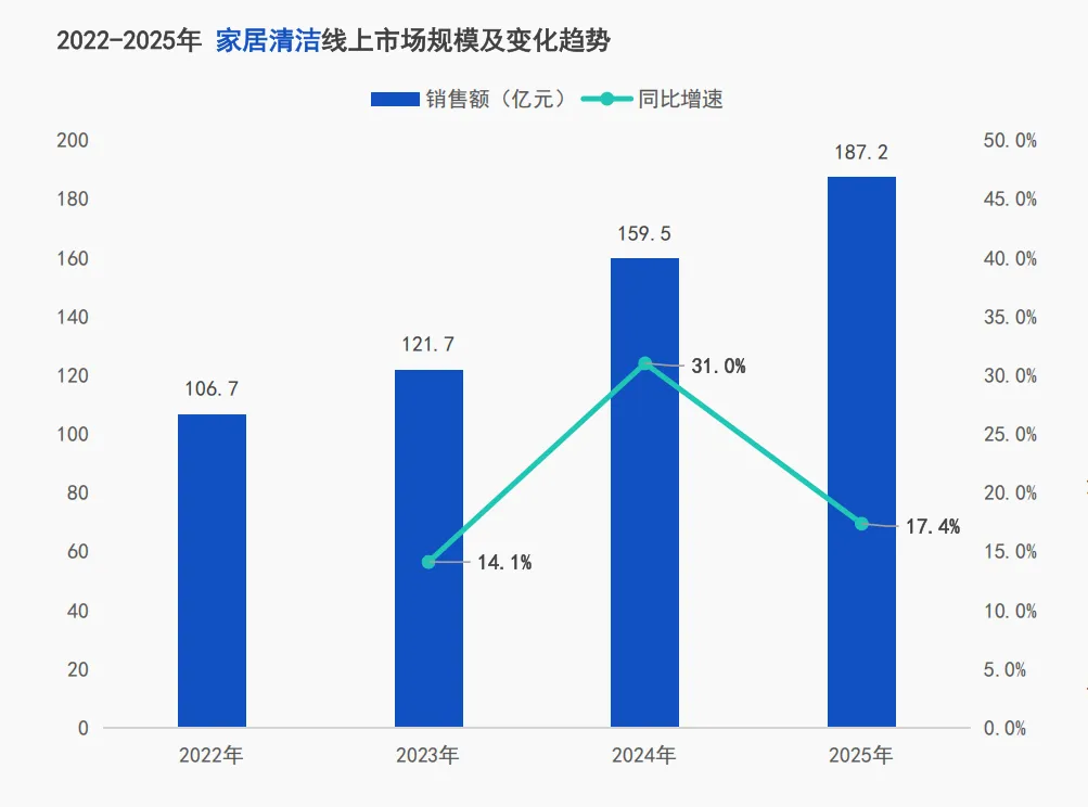2022年-2025年,家居清洁市场走出一条稳健上扬的曲线,2025年市场规模达到了187.2亿元,规模的持续扩大印证了“清洁刚需”的消费底色。
