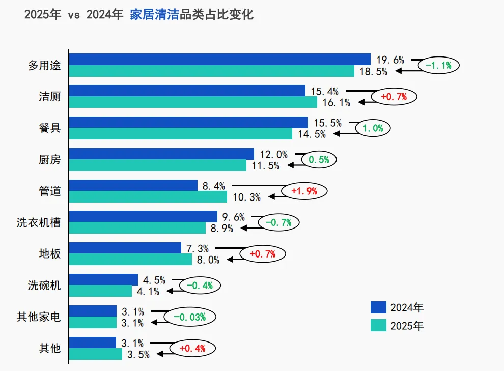 品类占比迎来结构性调整,多用途类虽份额下滑但仍居领先,表明消费者对多功能便捷性的核心需求;管道类清洁产品占比实现1.9%份额增长,反映清洁需求从基础区域向细小角落深度拓展。