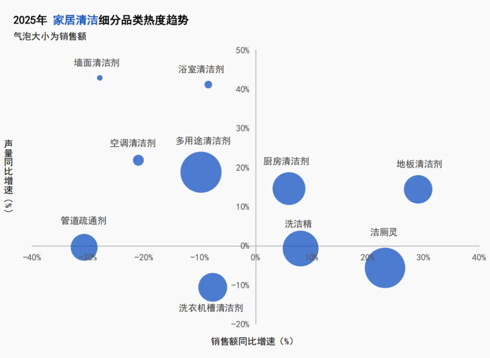 基于社媒声量与销售额同比增速交叉分析,地板清洁剂领跑大盘,成为高增长高热度的明星品类。洁厕灵与洗洁精虽销售额保持增长,但社媒讨论度均呈下滑趋势;多用途清洁剂销售额规模虽位居前列,但在高声量背景下同样面临下滑,反映出该赛道可能存在同质化竞争的问题。