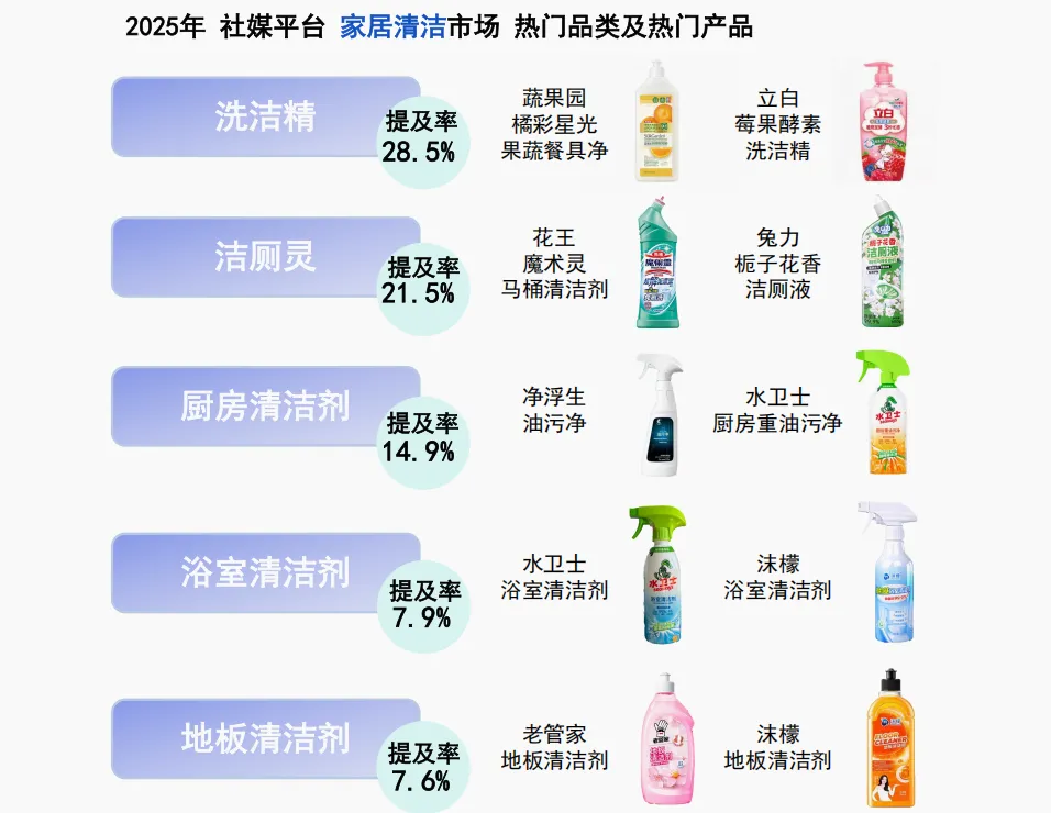 从社媒关注度看,洗洁精提及率28.5%位居榜首,洁厕灵21.5%次之,厨房清洁剂14.9%位列第三,分别体现日常刚需、卫生间深度清洁及厨房重油污场景的核心话题地位。